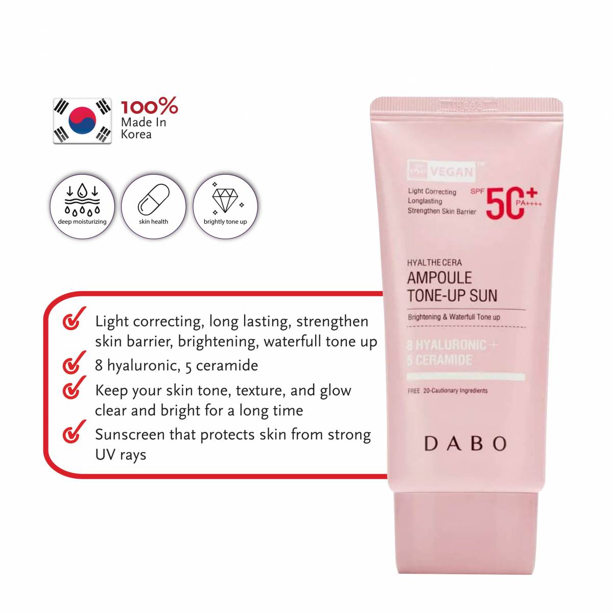 Reveal radiant, naturally glowing skin with DABO HYAL THE CERA Ampoule Tone-Up Sun, the revolutionary vegan sunscreen that does it all in one effortless step. Combining powerful SPF50+ PA++++ UV protection with advanced skincare and a light-correcting tone-up effect, this tinted sunscreen delivers everything your skin needs to stay bright, hydrated, and beautifully luminous all day.