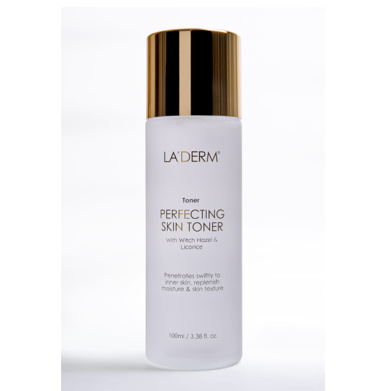 LA’DERM Perfecting Skin Toner – Moisturizing agents of Perfecting skin lotion penetrates swiftly to inner skin to hydrate and replenish moisture and restore skin to its dewy and luminous look. No alcohol or irritant ingredients, contains hydroronic acid and can be used on sensitive skin.