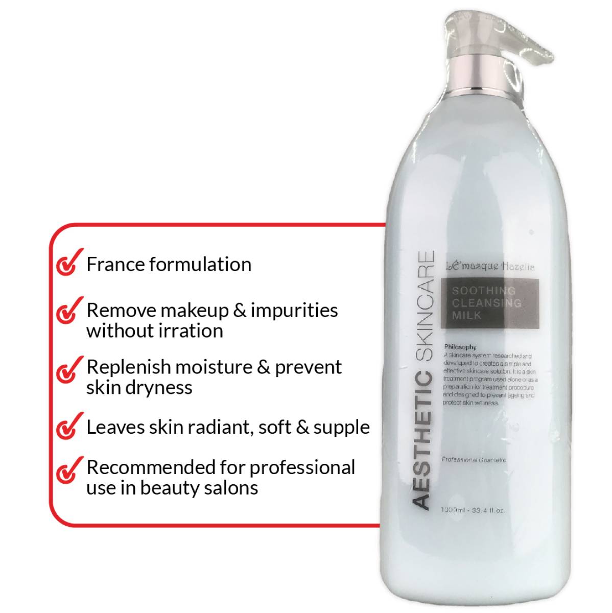 France formulation. Remove make up and impurities without irration. Replenish moisture and prevent skin dryness. Leave skin radiant, soft and supple. Recommended for professional use in beauty salon
